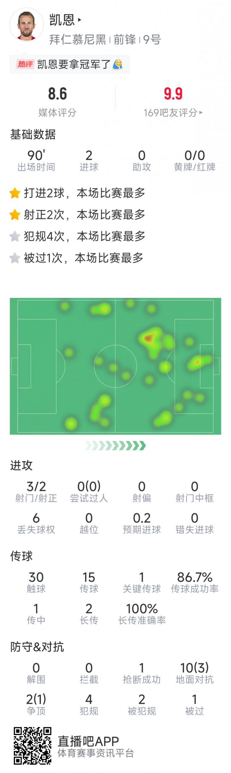 凱恩本場數據:梅開二度,3射2正,1次關鍵傳球,評分8.6分