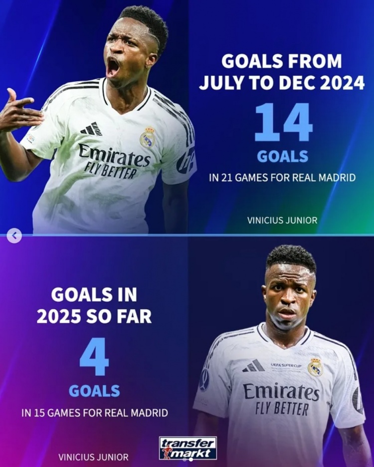 3月5日訊 皇馬即將迎來同馬競的歐冠同城德比,維尼修斯狀態能否回暖值得期待。數據統計顯示,維尼修斯在本賽季上半程(7月至12月)21場打進14球,而進入2025年后15場僅4球入賬。作為對比,姆巴佩在
