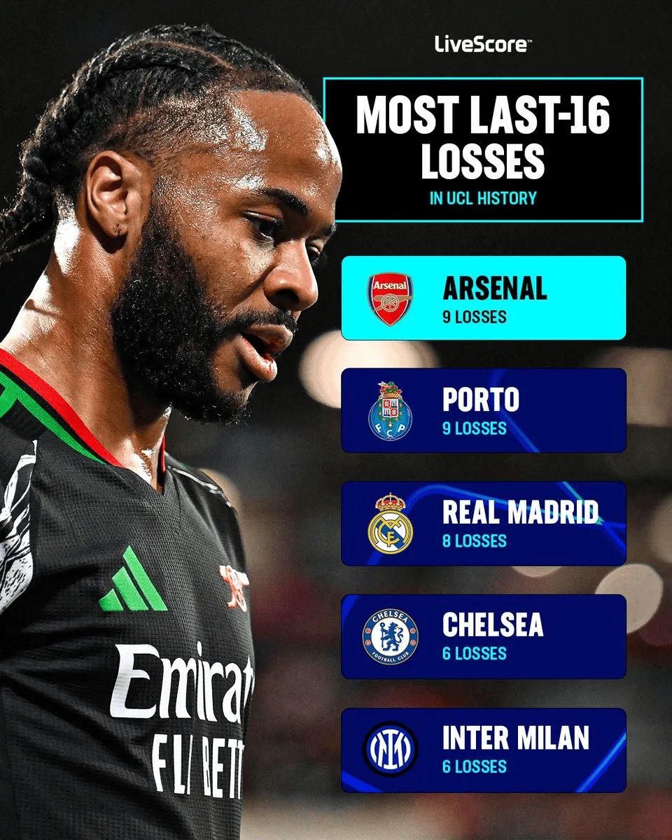 將戰埃因霍溫!阿森納在歐冠16強賽中失利9次,和波爾圖并列最多