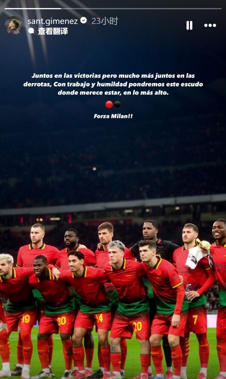 3月5日訊 意甲第27輪,米蘭1-2不敵拉齊奧,慘遭聯賽三連敗。賽后,S-希門尼斯更新社媒,為球隊鼓舞士氣。S-希門尼斯曬出賽前全隊合影,并寫道:勝利時我們團結一致,失敗時更會同舟共濟。通過努力和謙遜