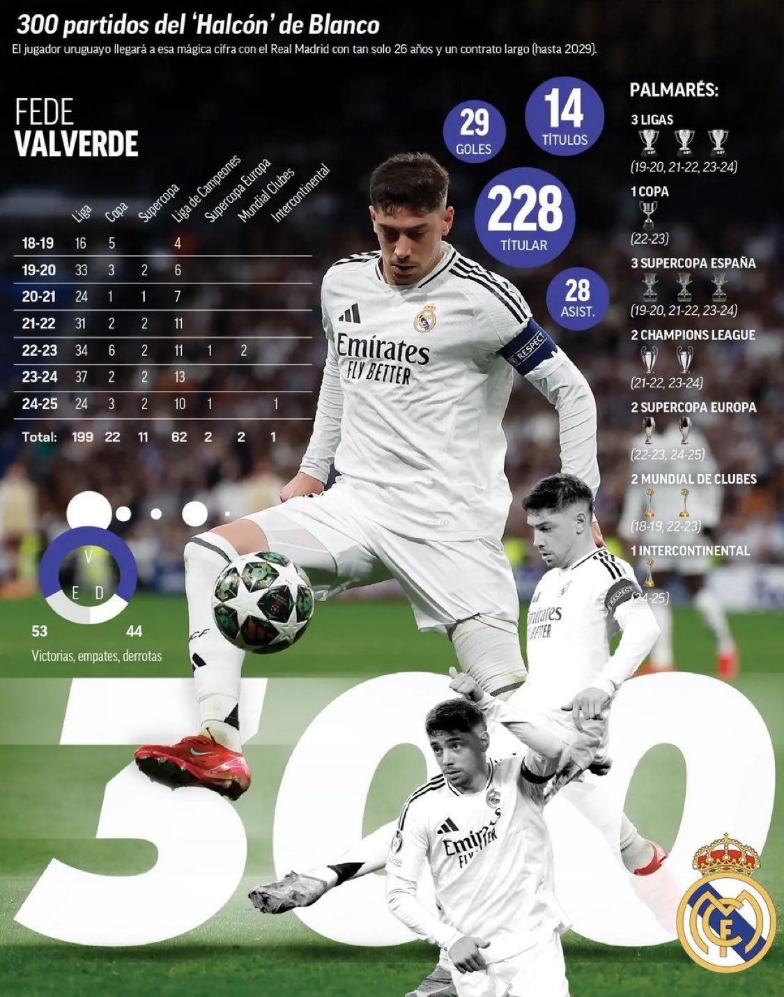 巴爾韋德達成皇馬生涯300場里程碑,同期29球28助攻+14冠軍