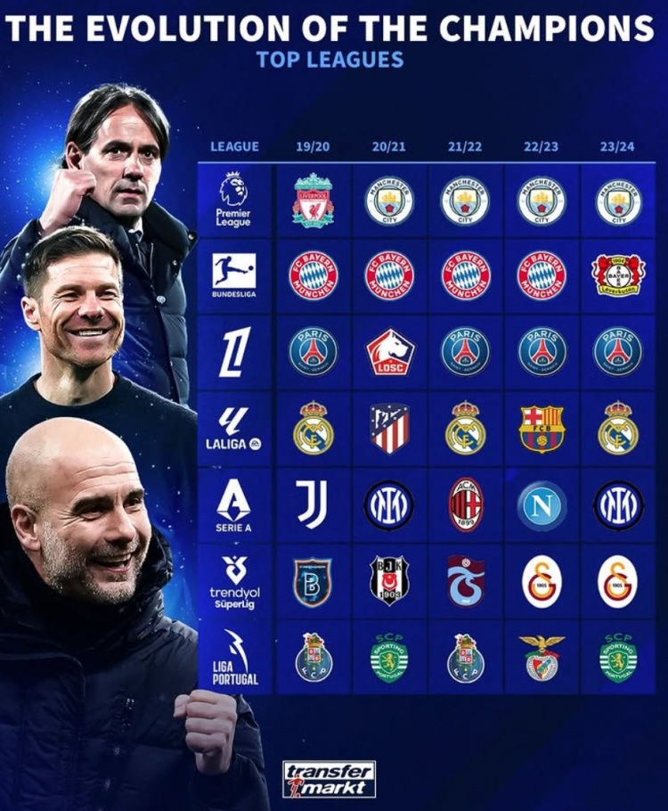 3月2日訊 《轉會市場》列出了歐洲七大聯賽近5年聯賽冠軍情況,英超、德甲和法甲班霸均只讓冠軍1次旁落。德轉列歐洲七大聯賽近5年冠軍:英超:利物浦、曼城、曼城、曼城、曼城德甲:拜仁、拜仁、拜仁、拜仁、勒