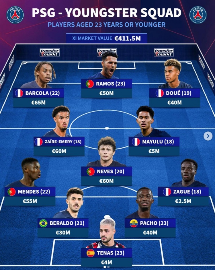 青春風暴!德轉列巴黎U23陣:總價4.12億歐,巴爾科拉&內維斯領銜