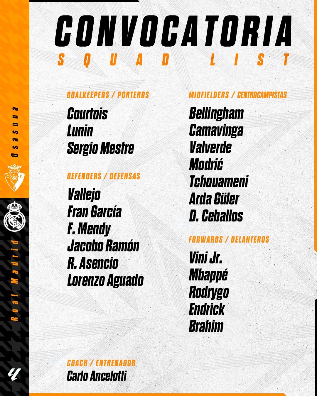 皇馬本輪客戰(zhàn)奧薩蘇納大名單:貝林厄姆領(lǐng)銜,姆巴佩、魔笛在列