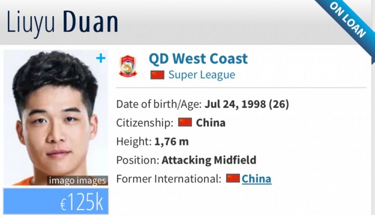 德轉(zhuǎn)顯示段劉愚將再度租至青島西海岸,租期至今年12月31日