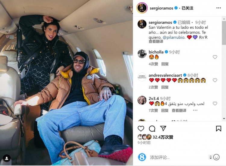 2月15日訊 拉莫斯更新社媒動態,慶祝情人節。拉莫斯社媒曬出與妻子皮拉爾-盧比奧在飛機內的合照,配文:“在你身邊每天都是情人節……我們仍然會慶祝這個節日,我愛你。”拉莫斯與皮拉爾2012年開始交往,兩