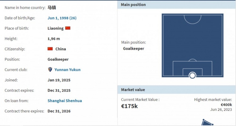 2月15日訊 《轉會市場》顯示,云南玉昆租借上海申花門將馬鎮花費26.3萬歐元,約合人民幣200萬元。馬鎮曾效力于天津天海、上海申花,2024賽季代表申花出戰4場,其中3次首發。
