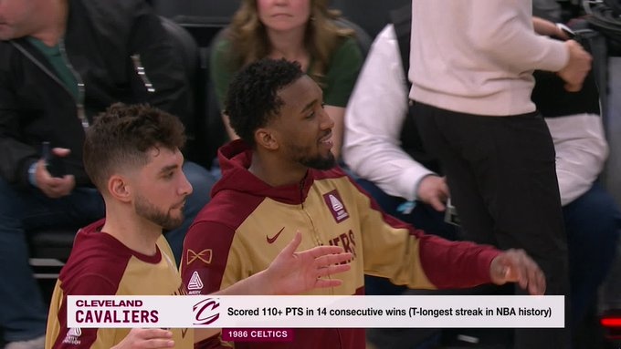 3月10日訊 NBA常規賽,騎士客場末節發力112-100大勝雄鹿。轉播方曬出數據,騎士目前取得14連勝,且這期間他們每場得分都是110+。這也追平了凱爾特人在1985-86賽季保持的NBA歷史紀錄!