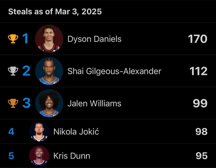 本賽季總搶斷數前5:丹尼爾斯170次遙遙領先 SGA第2 約基奇第4
