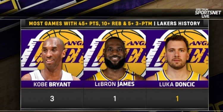 據統計,東契奇成為了湖人隊史第三位單場至少45分、10籃板并命中至少5三分的球員。前兩位是科比(3次)和詹姆斯。