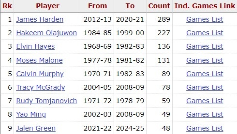 杰倫-格林生涯第49場比賽30+ 追平姚明 并列火箭隊史第8位