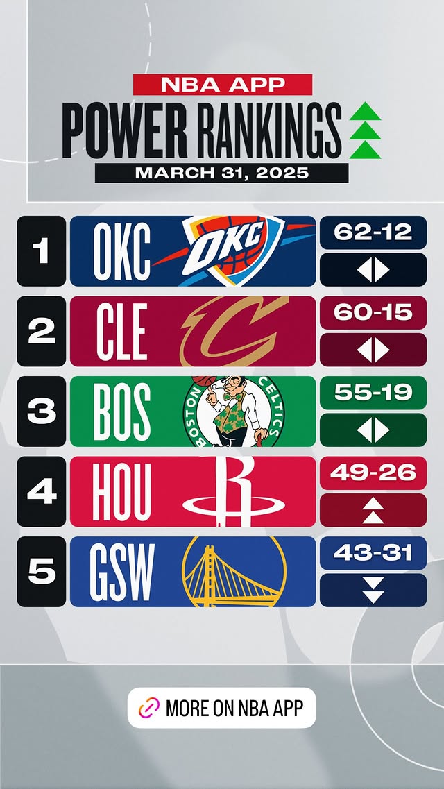 戰力榜:火箭狂飆4位升至前四!勇士下降1位排名第5&湖人跌出前五