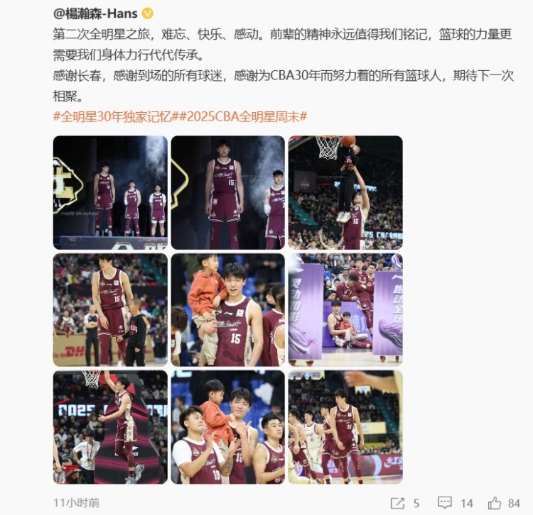 楊瀚森配文:“第二次全明星之旅,難忘、快樂、感動。前輩的精神永遠值得我們銘記,籃球的力量更需要我們身體力行代代傳承。感謝長春,感謝到場的所有球迷,感謝為CBA30年而努力著的所有籃球人,期待下一次相聚。”