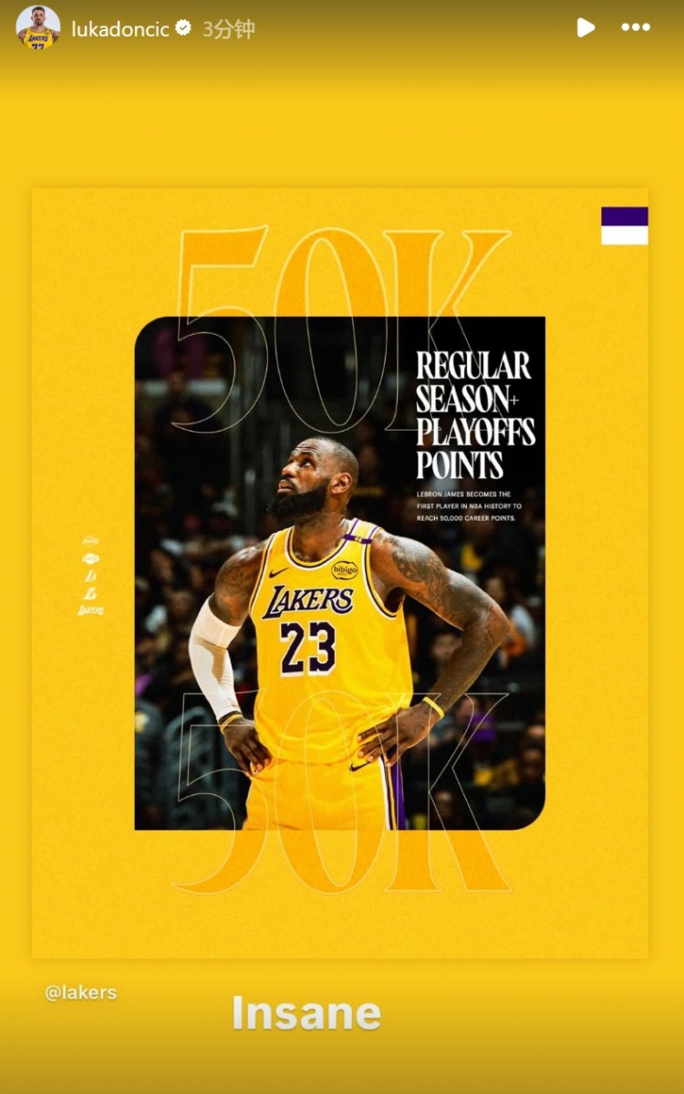 在本場(chǎng)比賽中,詹姆斯生涯總得分突破50000分;賽后,東契奇轉(zhuǎn)發(fā)了海報(bào)并評(píng)論道:“太瘋狂了?!?/p>