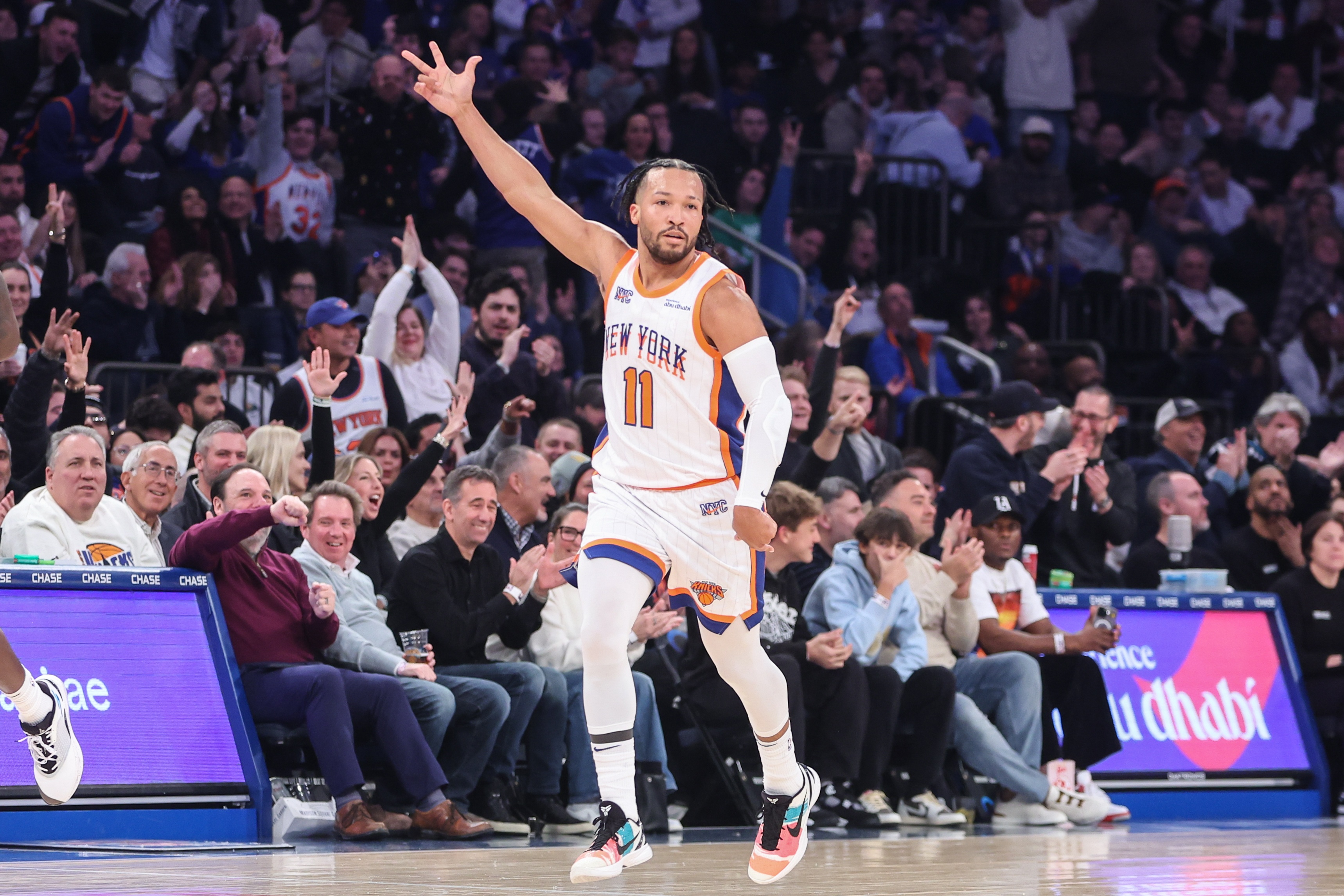 布倫森一個人扛著尼克斯,39分10助攻拼到傷退,硬解電風扇和范德彪,加時賽甚至持球殺傷莽老詹,188公分像個巨人一樣罩著紐約——除了他,其他人再不能持球硬解湖人的對位防守。