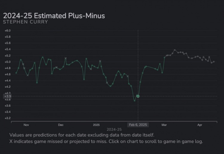非常有趣的是,斯蒂芬的預計正負值在勇士隊交易得到吉米之后就完全像火箭一樣飛升了。