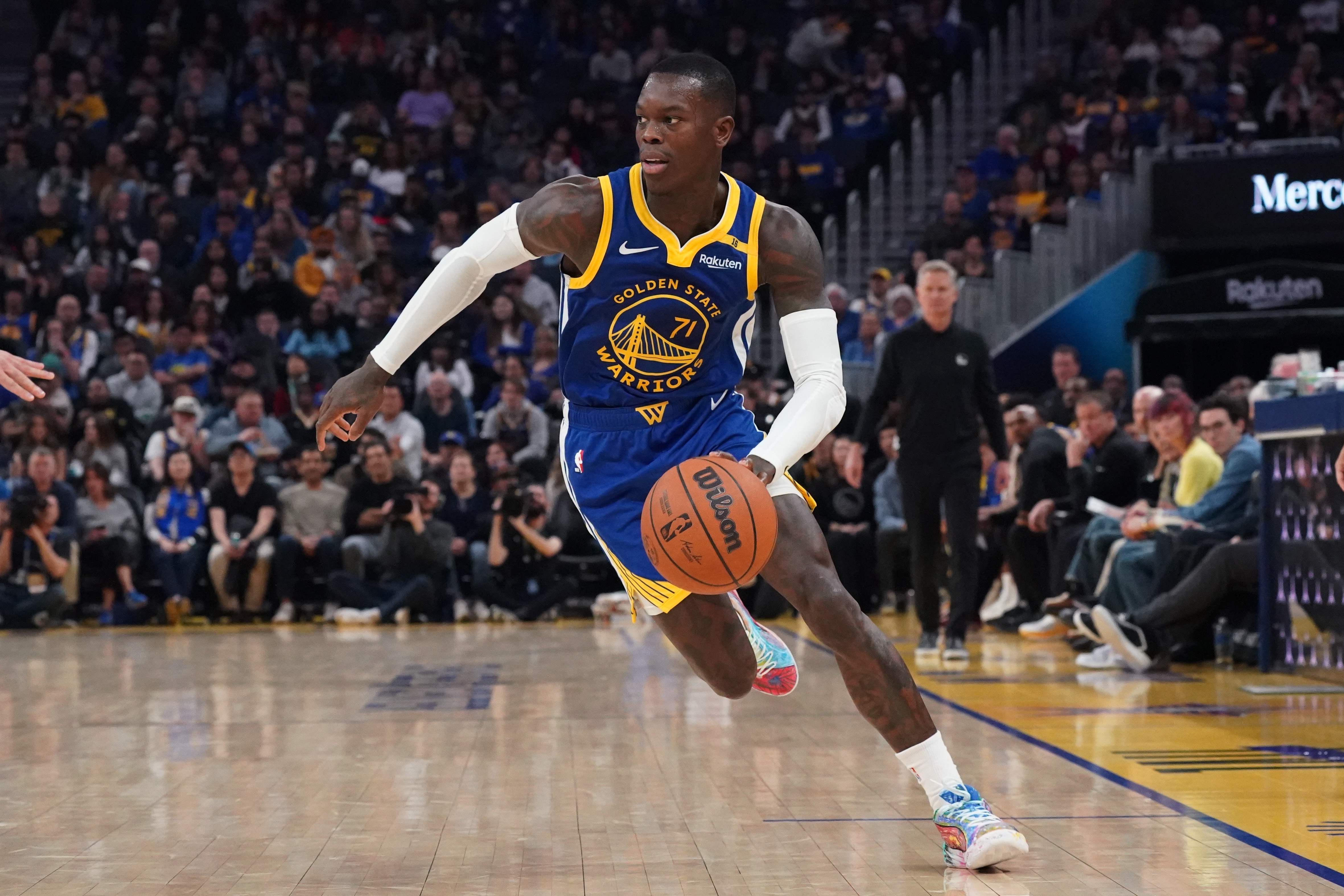 這就是勇士隊在12月中旬交易來丹尼斯-施羅德的初衷:試圖為已經淪為聯盟倒數三分之一的進攻注入新的活力,并在一系列嘗試中做出新的努力,以止住在庫里離場時的失血。但是,盡管勇士隊在交易后堅稱一名高位擋拆組織者將是對球隊的有益補充(在主教練史蒂夫-科爾的帶領下,球隊有時會固執地避免過度依賴籃球中最流行的戰術),但施羅德并沒有融入球隊,他場均可以得到10.6分,三項投籃命中率分別為38%、32%和74%。根據Cleaning the Glass的數據,當施羅德在場上時,勇士隊在每100個非垃圾時間的進攻回合中凈負9.9分,當他在庫里休息時主導進攻時,球隊的得分水平仍然處于墊底。