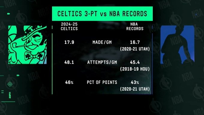 轉播方曬出一組本賽季凱爾特人和NBA歷史三分數據的對比: