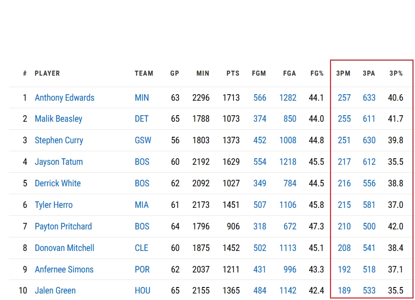 聯盟三分榜,愛德華茲繼續位居榜首(257記),比斯利排名第二(255記),庫里今日之后超越250記,三分總數來到251記,迅速逼近。