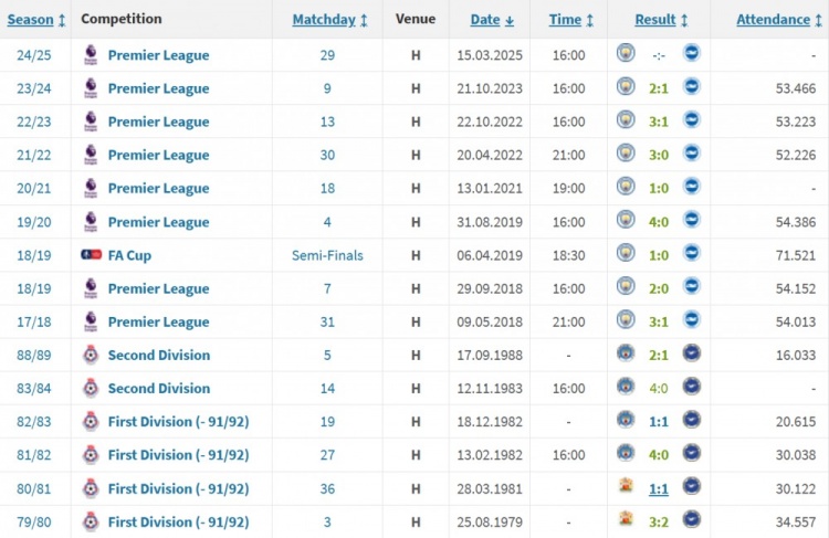 12勝2平,曼城歷史上各項(xiàng)賽事主場(chǎng)對(duì)陣布萊頓未嘗敗績(jī)?