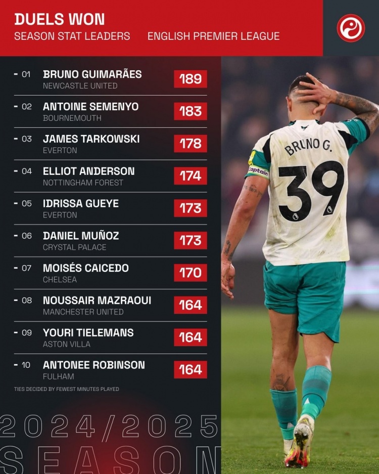 3月18日訊 國家隊(duì)比賽周到來,英超也暫時告一段落,squakwa統(tǒng)計了本賽季英超成功對抗情況,吉馬良斯居首。