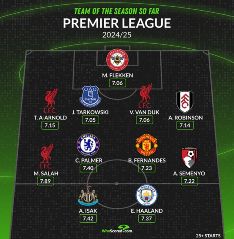 3月19日訊 數據網站Whoscored盤點了本賽季英超至今場均評分最高的11人陣容(至少25次首發),其中薩拉赫、哈蘭德、B費等人在列,具體陣容如下: