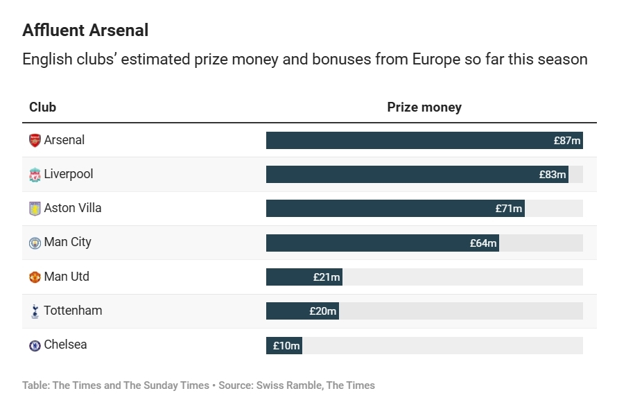 03月19日訊 泰晤士報(bào)統(tǒng)計(jì)了截至目前英超球隊(duì)在歐戰(zhàn)的預(yù)估收入和獎(jiǎng)金。阿森納居首,利物浦次之,具體排名如下: