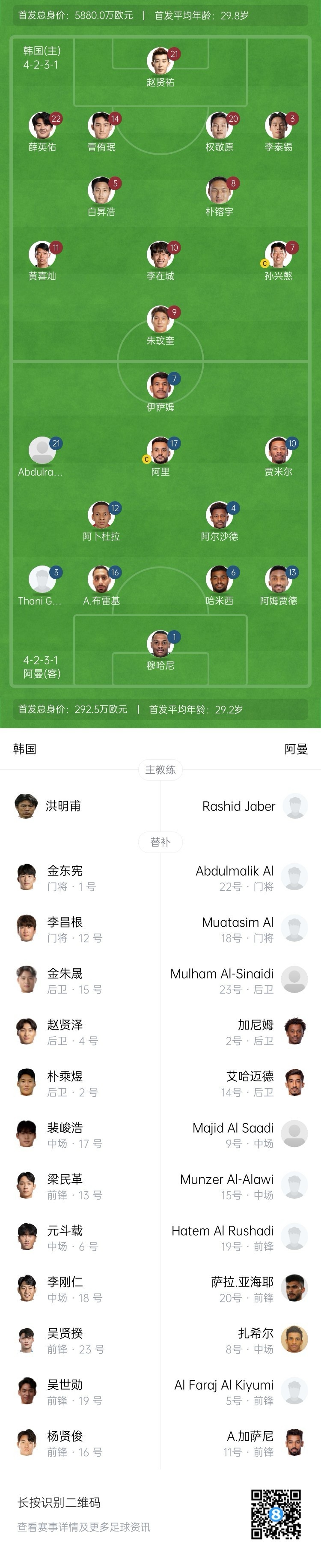 阿曼隊首發:1-穆哈尼、3-拉希迪、16-布雷基、6-哈米西、13-阿姆賈德、12-法瓦茲、4-阿拉伊、21-阿卜杜拉赫曼、17-布賽迪、10-亞哈馬迪、7-薩布希