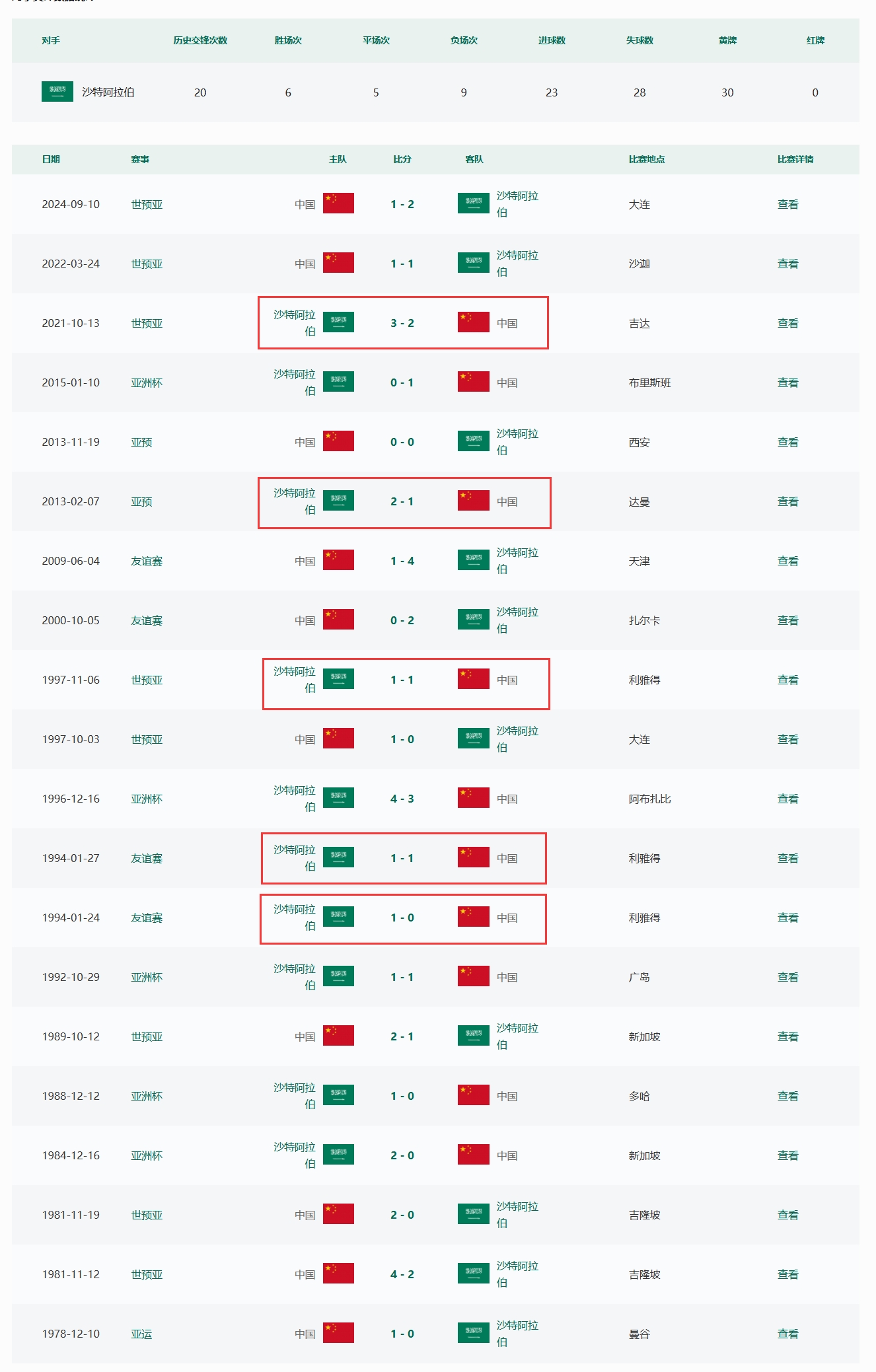 歷史交手數據顯示,國足共20次交手沙特,取得6勝5平9負的戰績。