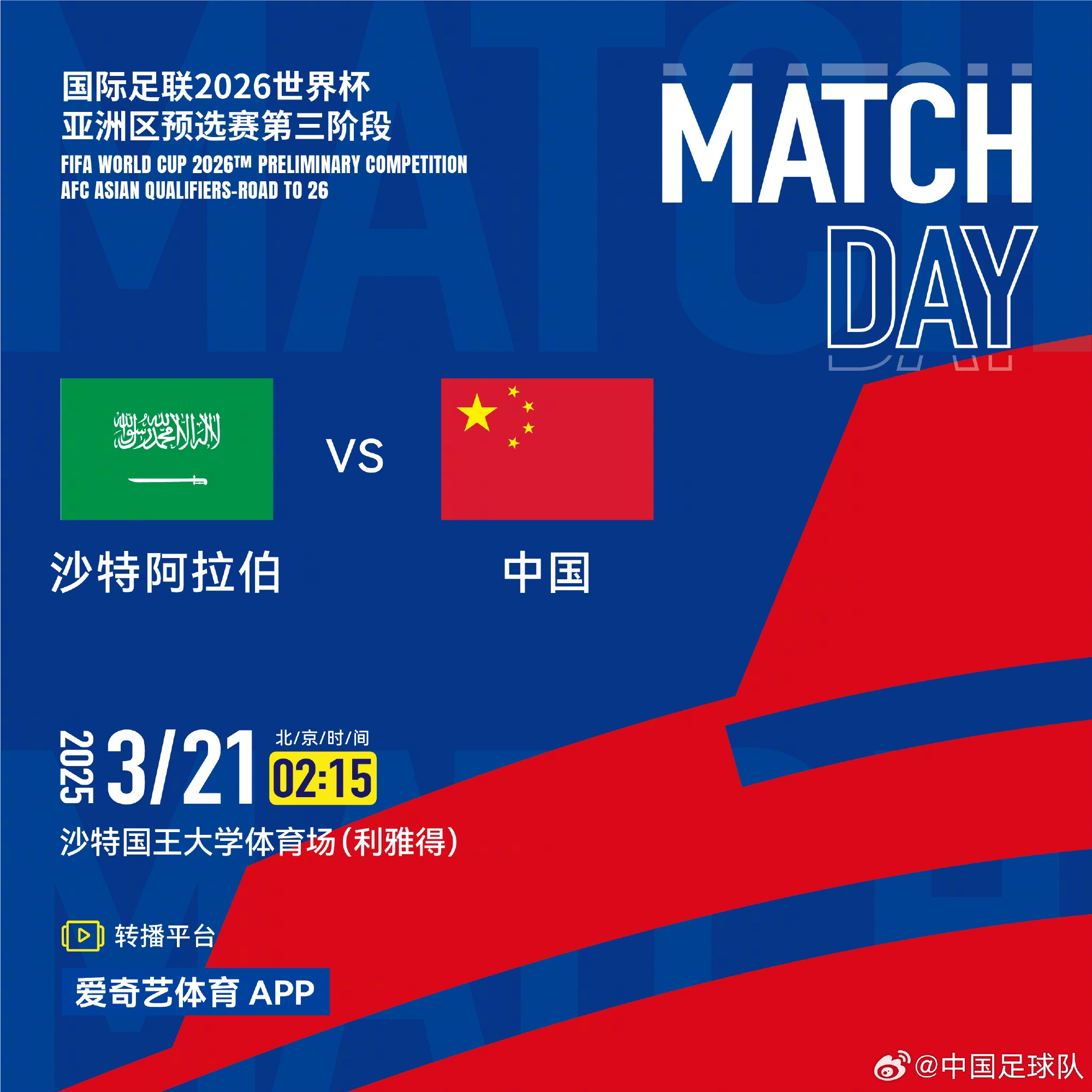 北京時間3月21日凌晨02:15,國際足聯2026世界杯亞洲區預選賽第七輪-中國國家男子足球隊將在利雅得沙特國王大學體育場對陣沙特阿拉伯國家男子足球隊。鎖定以下轉播平臺,一起為中國隊加油!