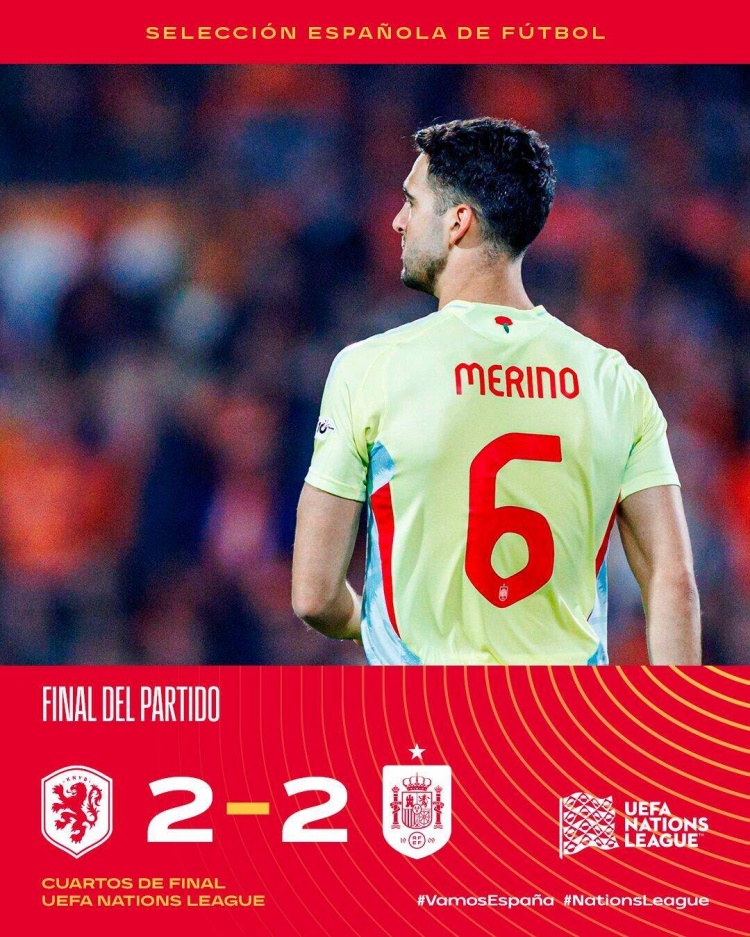 梅里諾補時絕平,荷蘭2-2西班牙,西班牙歐國聯五連勝終結。