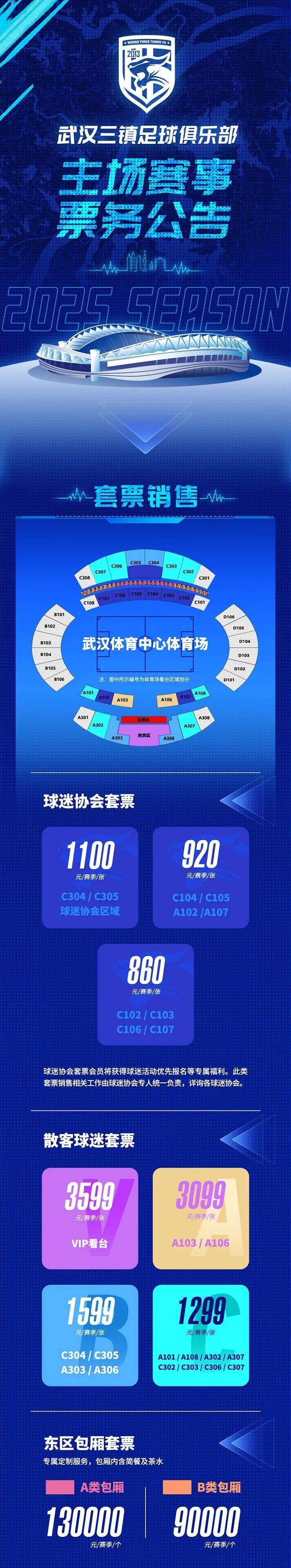 2025賽季武漢三鎮足球俱樂部主場票務銷售通道將于3月21日18:00正式開啟,全賽季套票即將進行發售。多種套票類型可供選擇,滿足廣大球迷朋友的觀賽需求,歡迎大家選購。