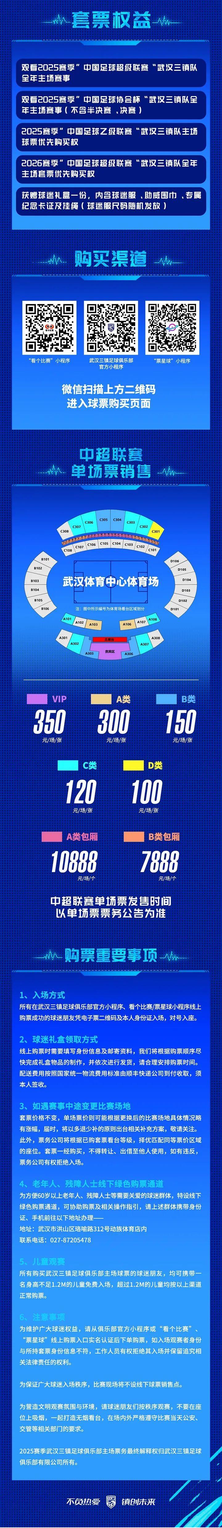 迎接主場,登上看臺,我們一起為武漢、為三鎮而戰!主場票務詳情請查看下圖:
