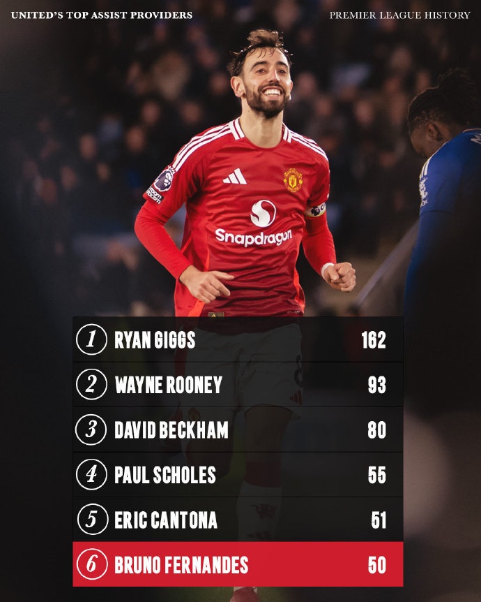 曼聯(lián)隊(duì)內(nèi)英超歷史助攻榜:吉格斯162次助攻斷層第一,B費(fèi)50次第六?