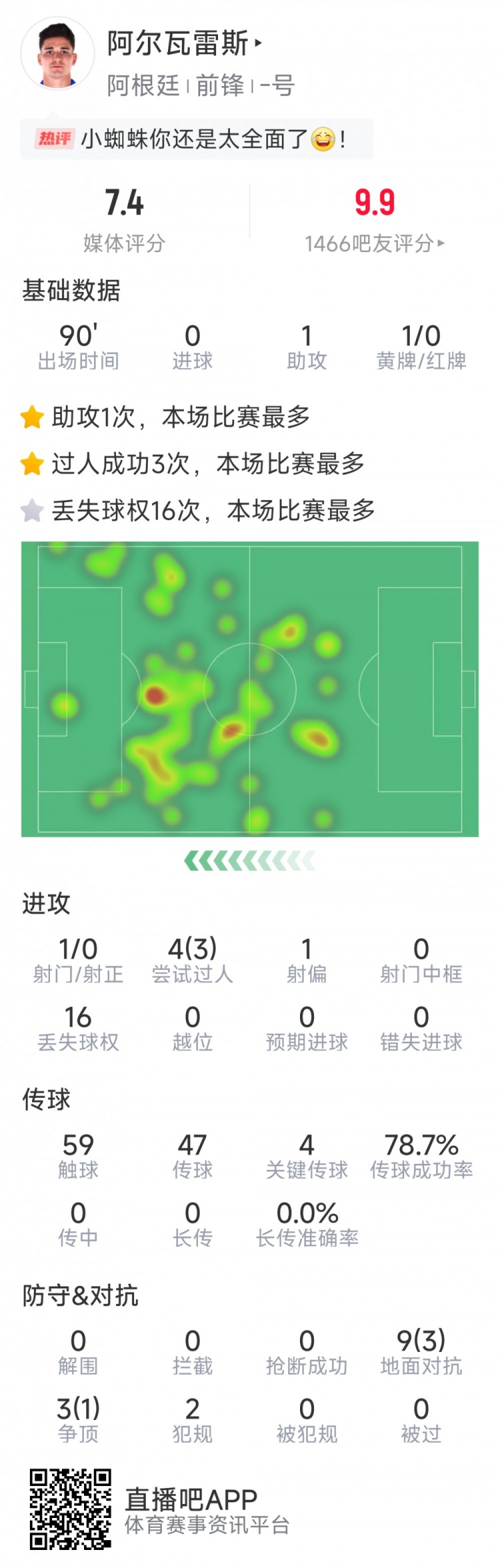阿爾瓦雷斯本場數據:1次助攻,4次關鍵傳球,3次成功過人?
