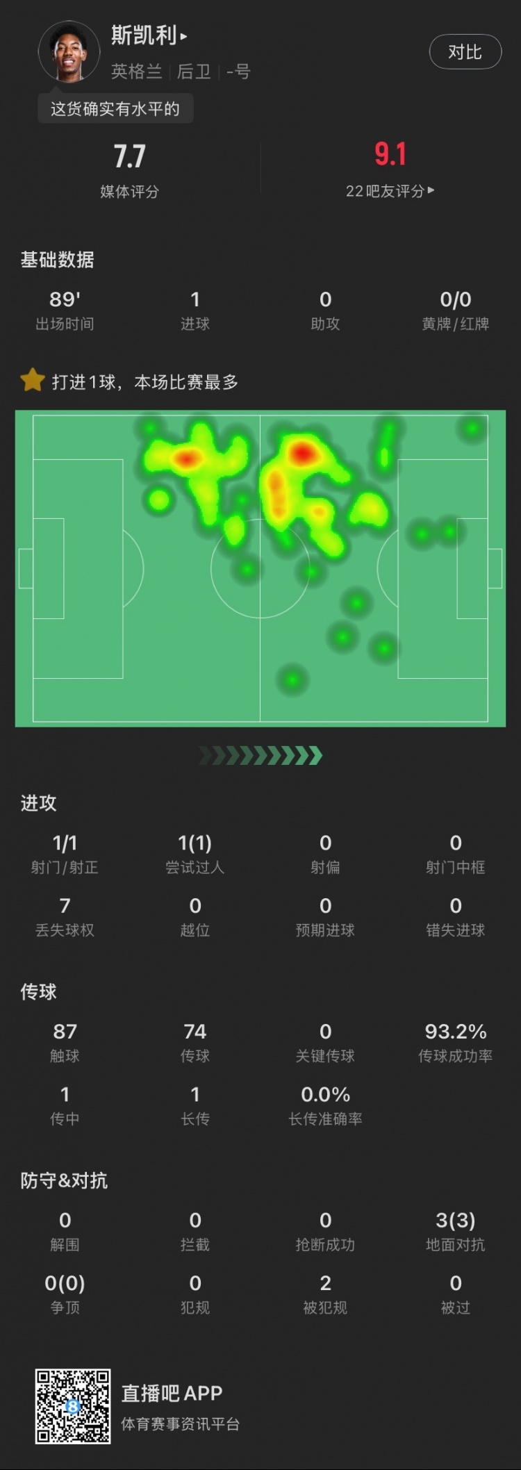 18歲斯凱利本場:首秀破門!3次對抗全部成功,1過人,獲評7.7分?