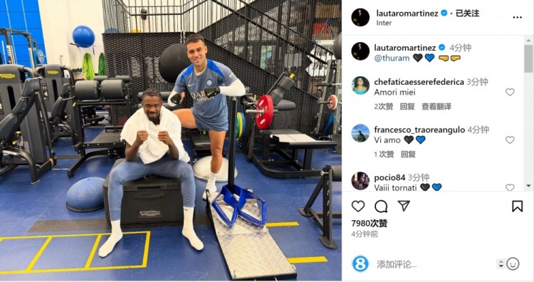 勞塔羅和小圖拉姆都因傷退出國家隊名單,回到俱樂部恢復。勞塔羅在社交媒體上曬出與小圖拉姆在健身房內的合照,并配上了藍黑之心和碰拳的表情符號。