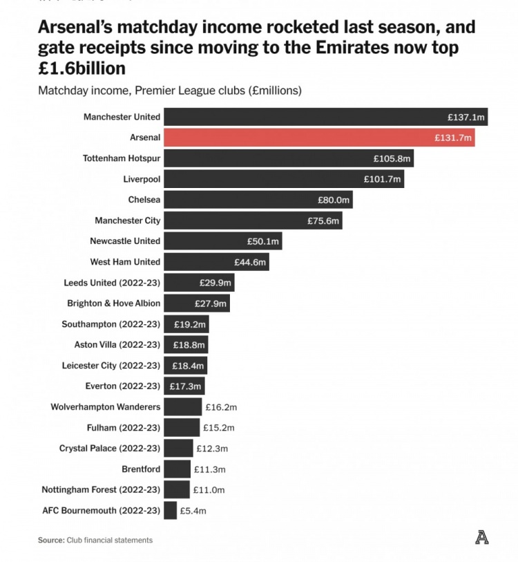 所以,那個賽季阿森納拿下了單賽季隊史最高門票收入,國內(nèi)比賽日收入躍升聯(lián)賽第二位。去年阿森納的比賽日收入僅比曼聯(lián)少了550萬英鎊,這也意味著兩隊之間的差距明顯縮小:此前兩個賽季,兩隊的比賽日收入都相差超過3000萬英鎊。盡管酋長球場的建設成本,可能在過去幾年里限制了球隊的發(fā)展,但如今搬遷的好處正在越來越明顯。