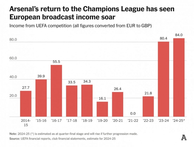 重返歐冠聯(lián)賽之后,阿森納在歐戰(zhàn)賽事中獲取的轉播收入飆升
