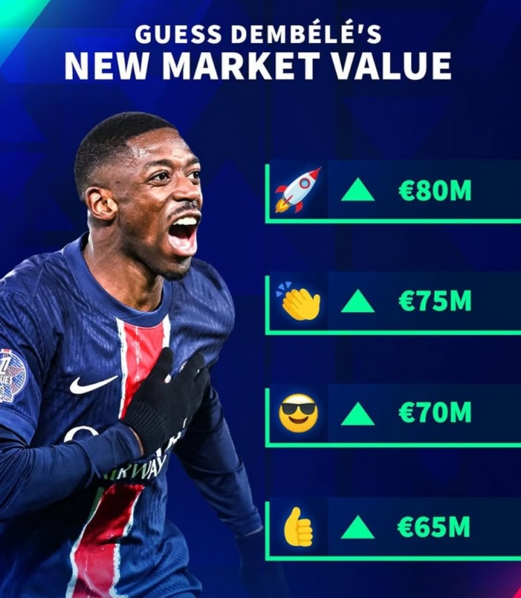 27歲的登貝萊本賽季各項賽事為巴黎37場貢獻30球7助攻,他當前德轉身價為5500萬歐元。《轉會市場》在預熱海報中給出的新身價最低為6500萬歐元,最高則可達到8000萬歐元。不知吧友們認為登貝萊的最新身價預計將是多少呢?