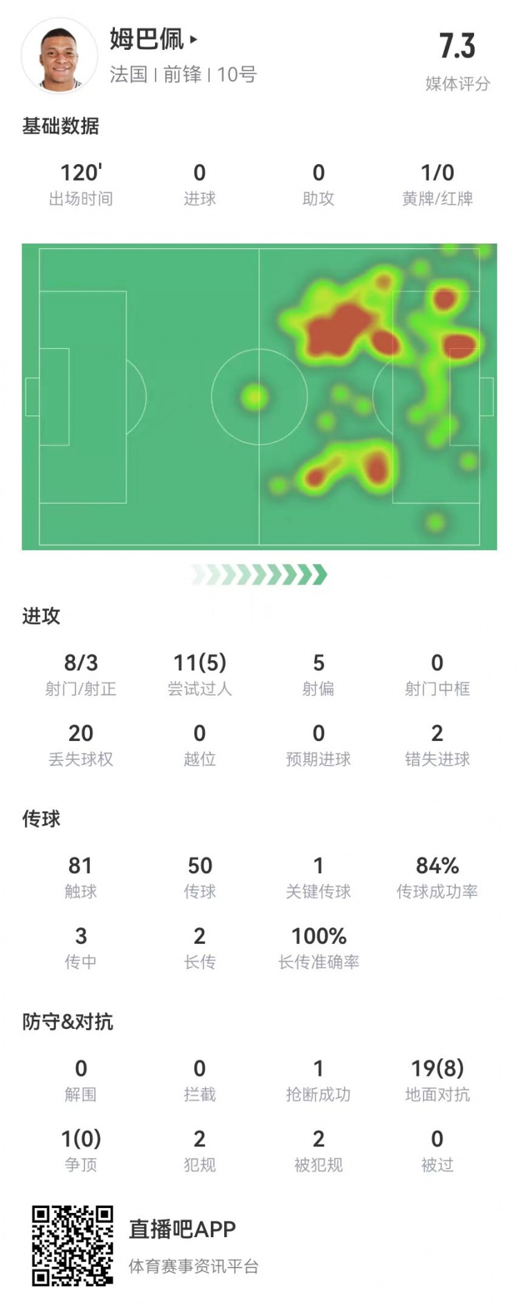 姆巴佩本場8射3正+2失良機+點射命中 20對抗8成功+20丟失球權?