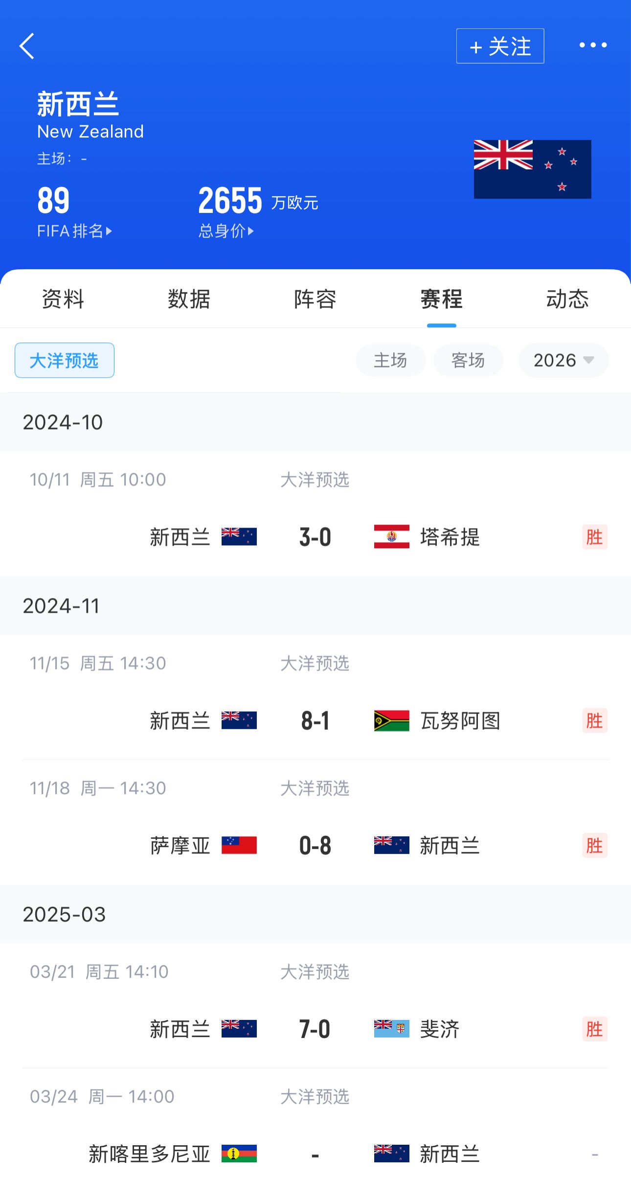 新西蘭FIFA排名第89,只比國足高1位,陣容身價2655萬歐,本屆預選賽至今4場打進26球只丟1球。