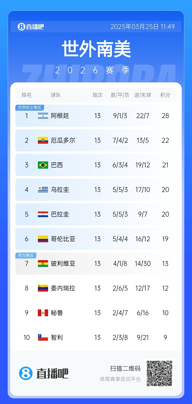 世預賽南美區已賽13輪、還剩5輪,前6可直通2026世界杯。目前阿根廷28分領跑,領先第7玻利維亞15分。