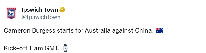 伊普斯維奇社媒:卡梅倫·伯吉斯首發代表澳大利亞隊對陣中國隊。格林威治時間上午11點開球。