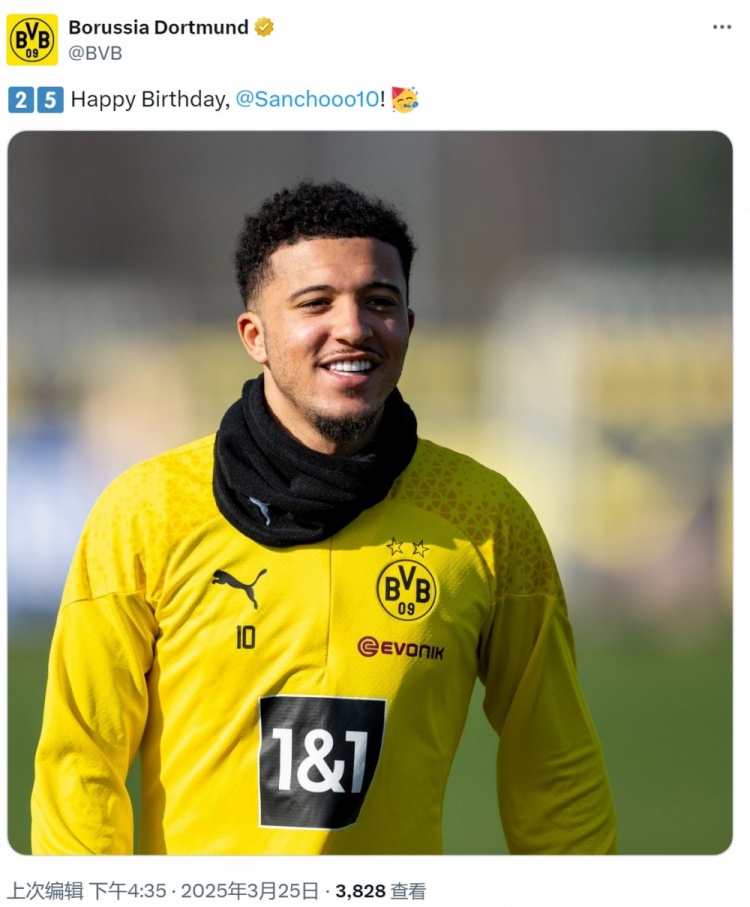 多特官方社媒曬出桑喬效力球隊時期的照片,并配文:“祝你25歲生日快樂,桑喬!”