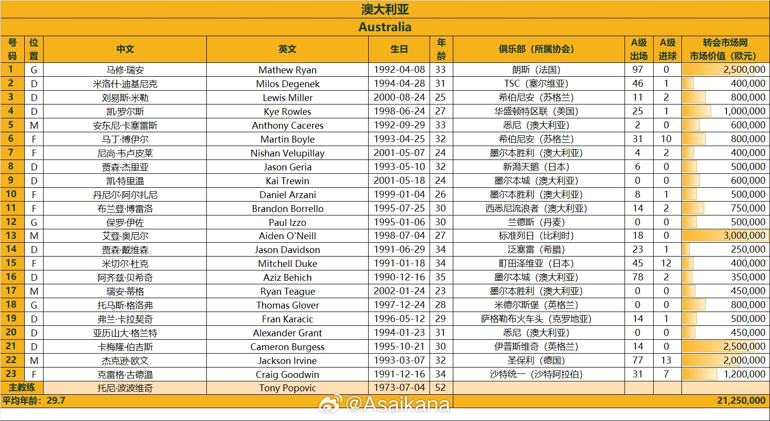 國足vs澳大利亞名單對比:平均年齡28.1-29.7,身價1145萬-2125萬?