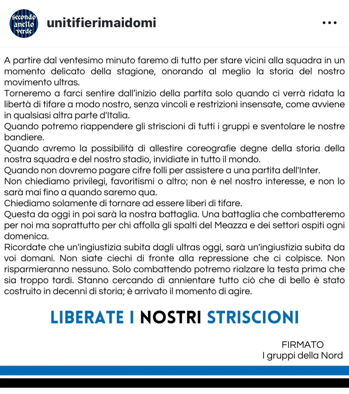 只有當我們重新獲得以自己的方式歡呼的自由時,我們才會重新讓自己的聲音響起。不受毫無意義的約束和限制,就像在意大利的任何其他球場發生的那樣。