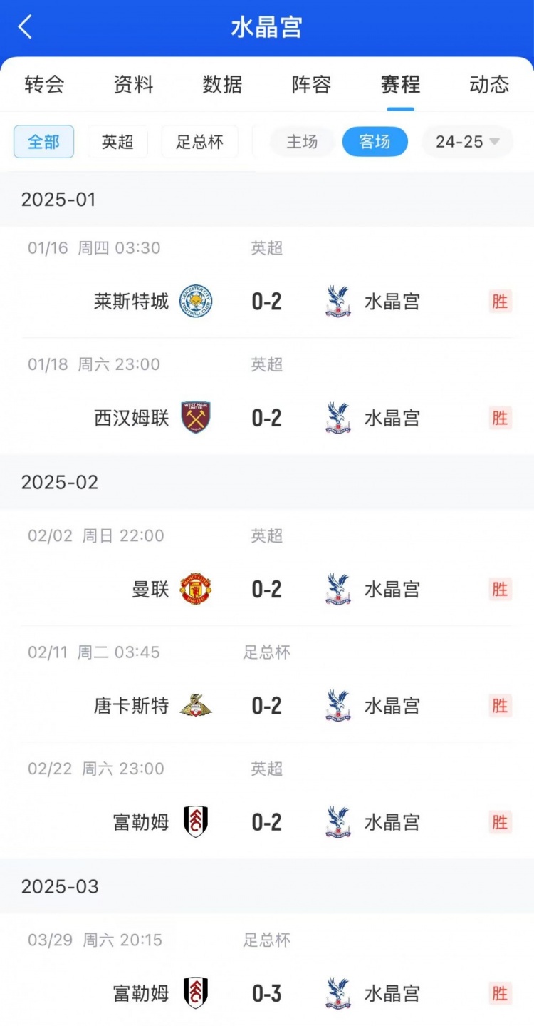 各項賽事客場6連勝+0丟球,水晶宮是英格蘭頂級聯(lián)賽歷史首隊