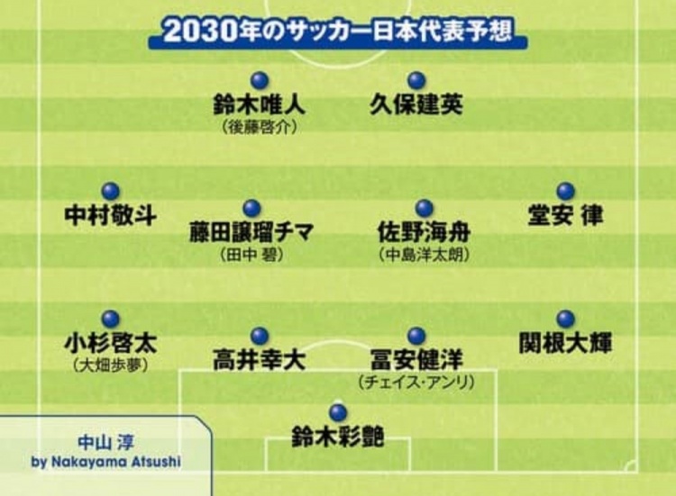 3月30日訊 據日媒Sportiva報道,近日該媒體開設專欄,開始對2030年世界杯日本隊首發陣容預測,有部分日本國內的自由撰稿人投稿對首發進行預測。以上撰稿人預測的陣容中,基本都是本期日本國家隊陣中的年輕球員,并結合部分現役U22國家隊、U20國家隊球員等組合而成。