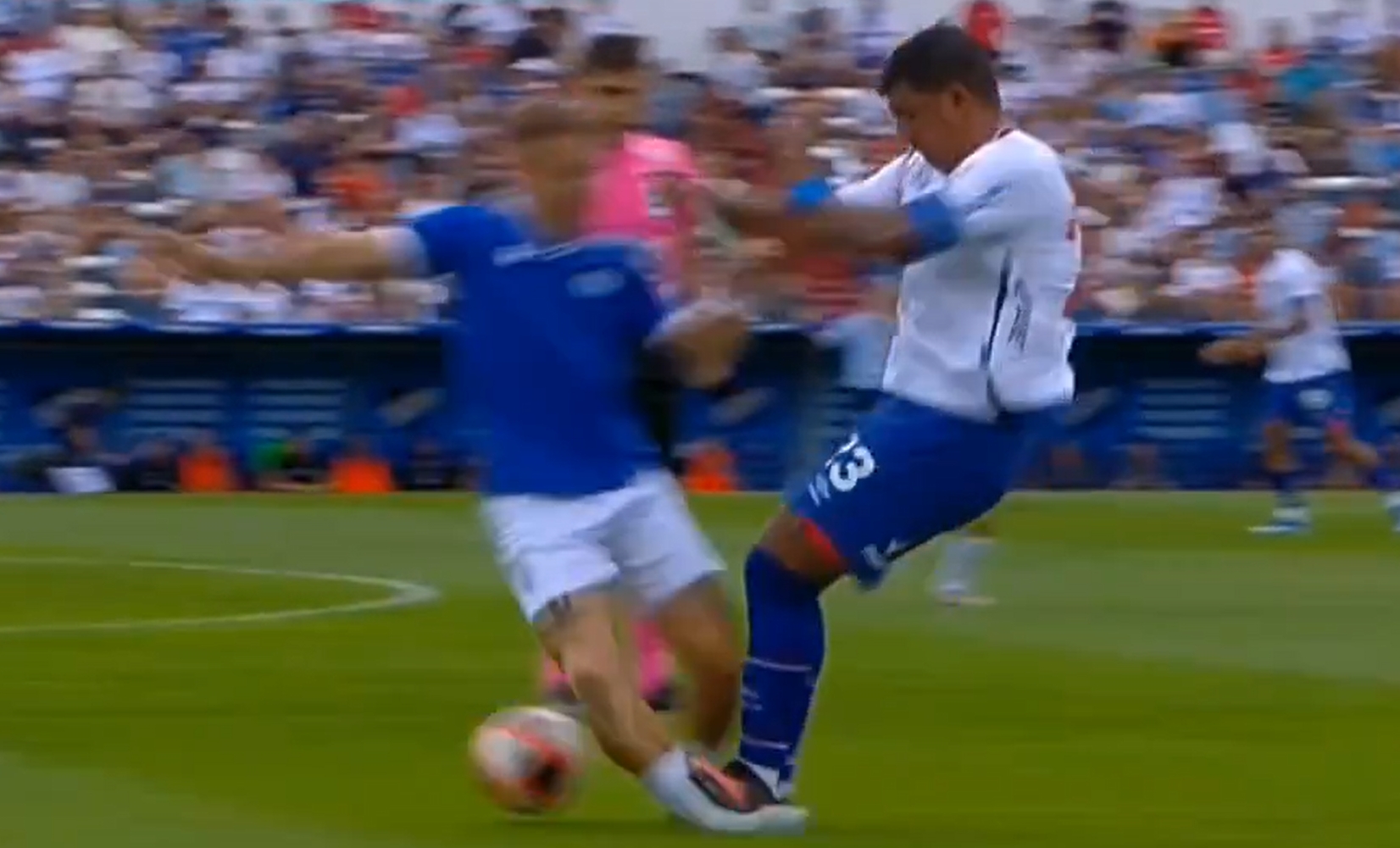 砸人飯碗啊!烏拉圭聯賽驚現雙腿跳起搶斷????對手小腿被踩變形